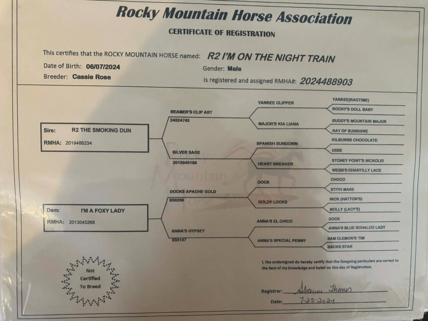Very willing and Loads, Leads, Ties, saddles without a hitch! This colt is CERTIFIED IN GAIT and started under saddle lightly. He is willing, easy minded and gentle with no vices from the very start. You point- he goes. We think he is very forgiving and going to be your ultimate trail horse!!
