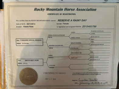 Considering Rainy is the last foal produced by Smith’s Misty Rose, and the first foal crop by our stallion, Special Reserve, We finished this mare with the goal to promote the breed further. She is ideal in all aspects we want to produce in the breed. Conformation, Foundation, Gait, Temperament. She is the last in a tried and true line of Foundation Rockies in her lineage. Rainy produced her first foal in 2021 and we are ecstatic for what she can do!
