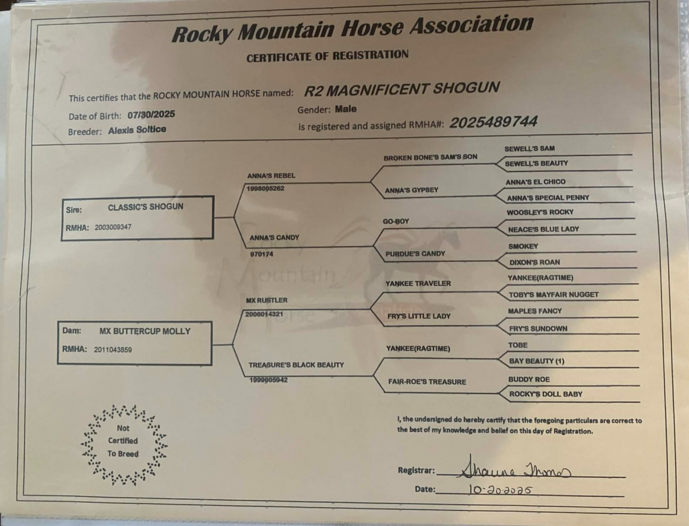 This is an exquisite and rare lineage we've been hoping to invest in for decades! We watched Classic's Shogun foals for 20 years! We also researched most of the horses existing on the dams side- maternal grandsire is a very nice producer of solid trail horses. The maternal grandmother is a fabulous horse, full of well gaited and sound of mind progeny. MX Buttercup Molly Herself is a very beginner friendly horse that totes the families whom owned her! With all that knowledge.... we finally shipped our first in-utero foal from Canada and are very pleased. He is a total package and we are hopeful for his future! If you have goals to support the breed, become a breeder, and/or enjoy the best stud prospect on the market, he could also be yours!